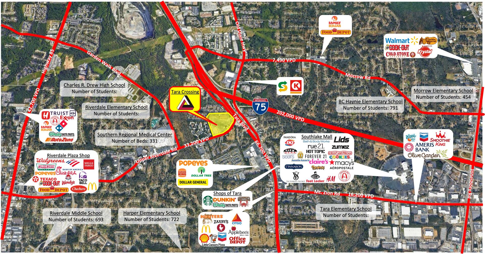 Traffic Count: 33,200 VPD on Upper Riverdale Rd and 66,700 on Tara Blvd.