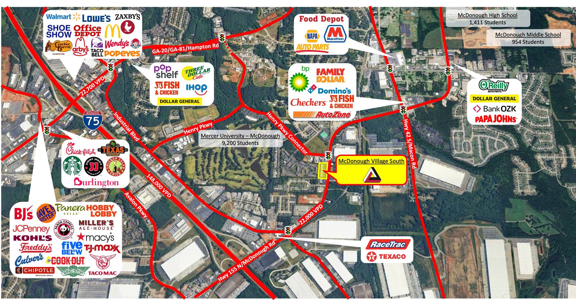 McDonough Village South is located on GA-Hwy 155 N/ McDonough Rd (22,000VPD) with a dedicated turn lane, and is only 5 minutes (0.5 miles) from I-75.