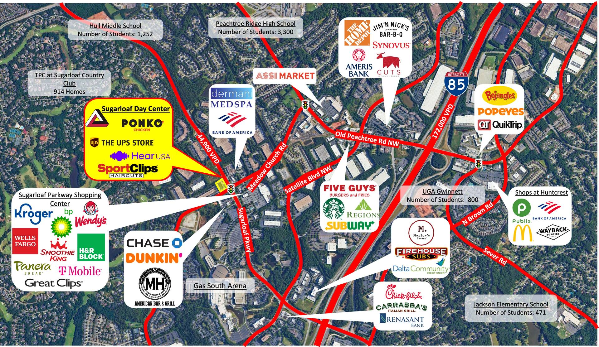 Sugarloaf Day Center is at a lighted intersection with dedicated turn lanes from Sugarloaf Pkwy and Meadow Church Rd.