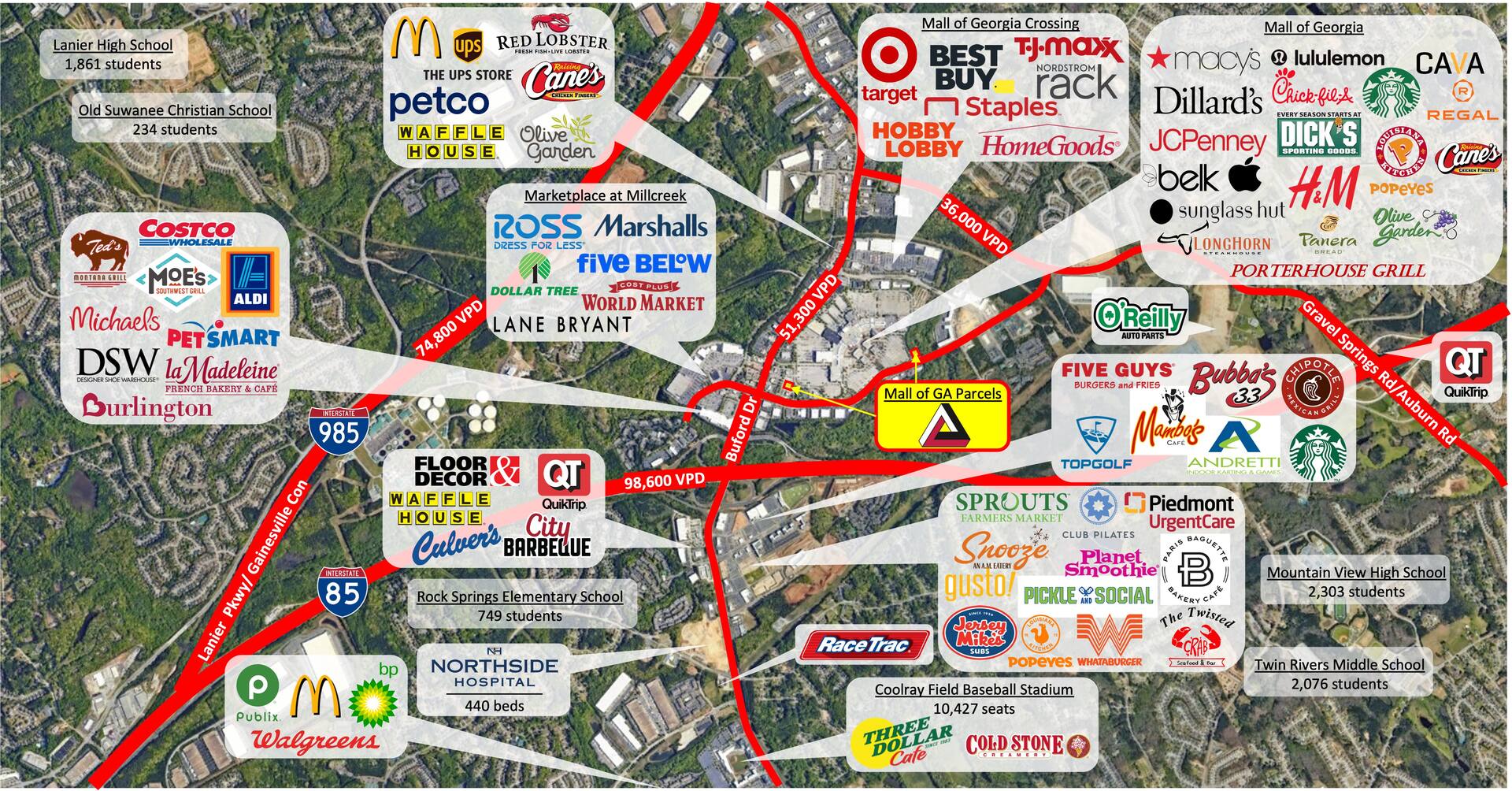 The population is 169,867, with an average household income of $136,442, within 5 miles of the Mall of Georgia.