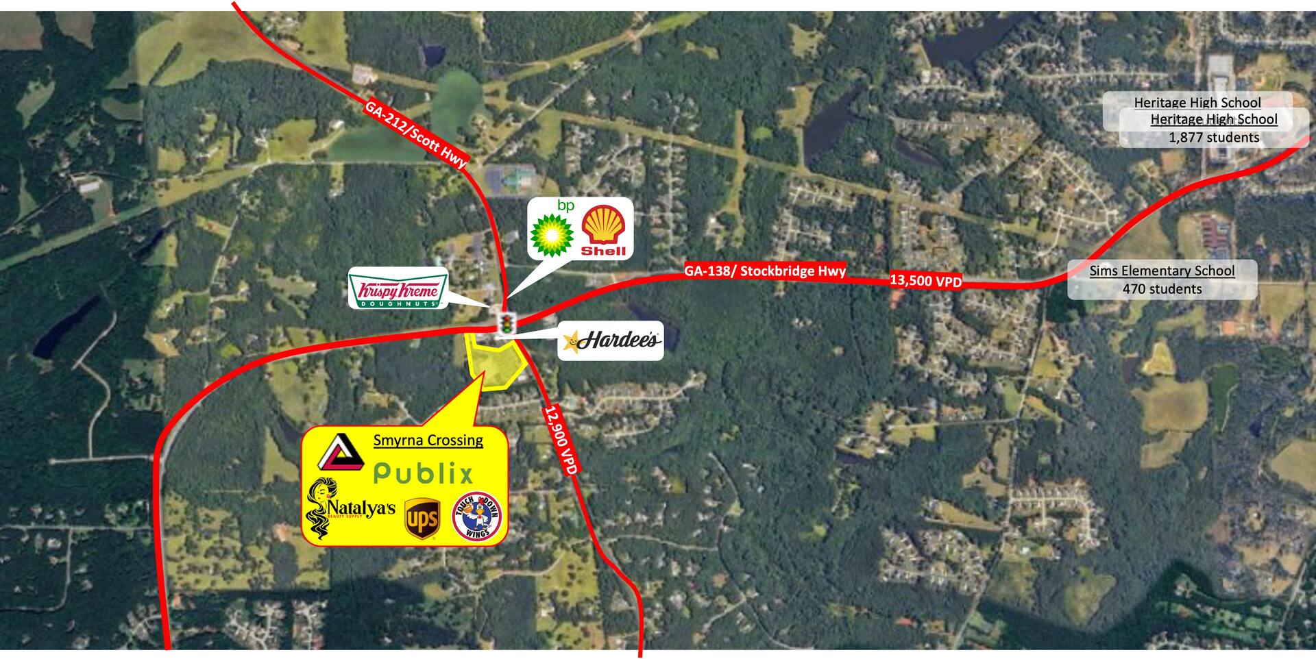 Smyrna Crossing is a Publix-anchored center located at the busy intersection of Stockbridge Hwy (13,500 VPD) and Scott Hwy (12,900 VPD).