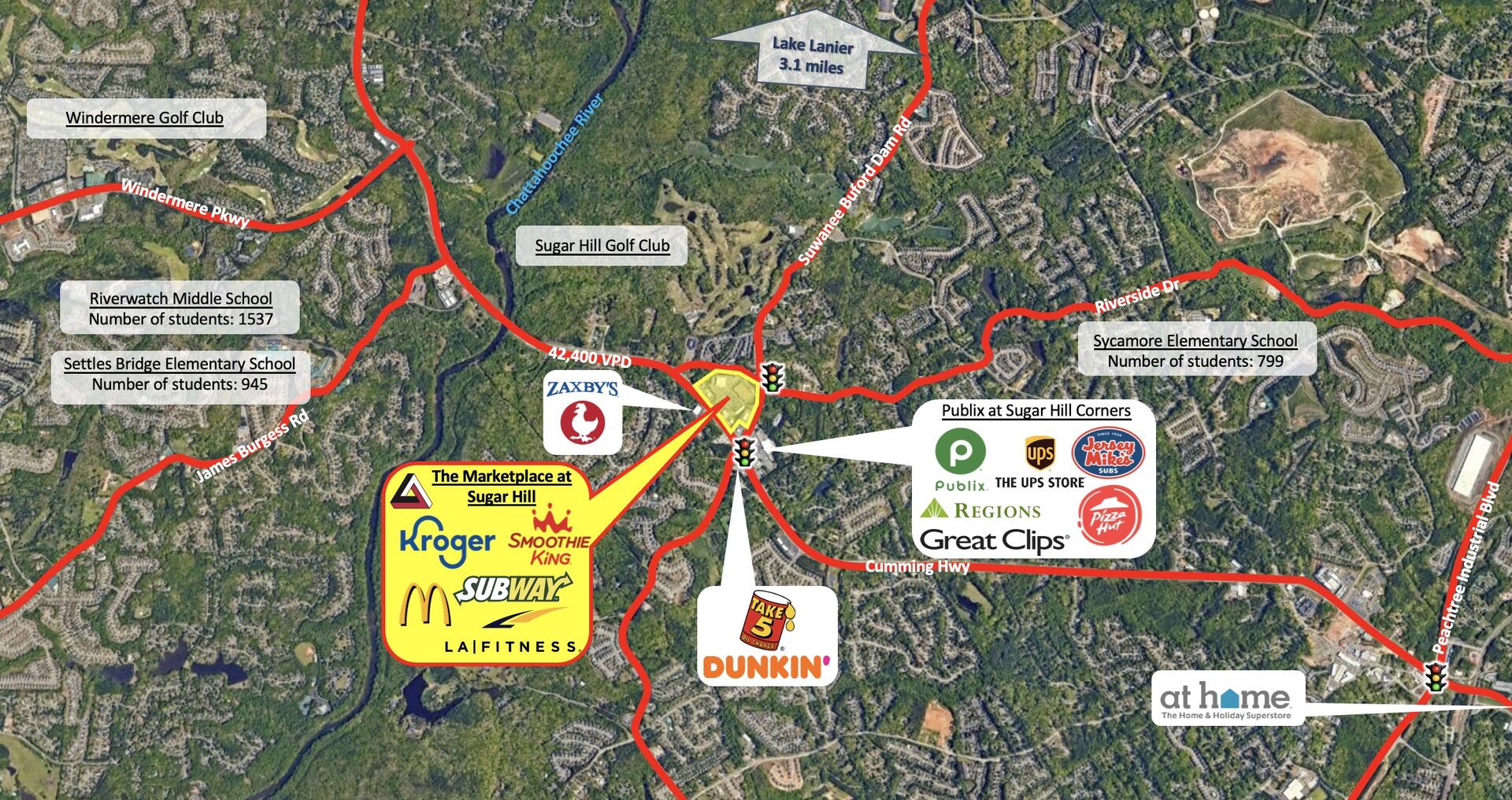 The property is 3.2 miles from Lake Lanier and is surrounded by parks, high-end golf courses, and residential communites.